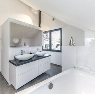 Statt klinisch rein wirkt das Bad gemütlich warm. Die Kombination aus weiß und Holz strahlt Ruhe aus und sorgt für die perfekte Entspannung.