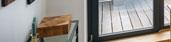Der Holzboden des Wohnzimmers setzt sich auf der Terrasse optisch fort und erweitert den Wohnraum. So entsteht ein fließender Übergang nach draußen.