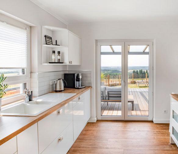 Kurze Wege Die Doppel f lügel tür führt von der Küche direkt auf die Terrasse. Das ist beim Grillen oder Abendessen im Sommer besonders praktisch.