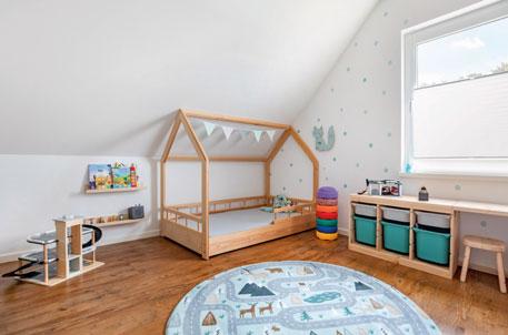 Das Kinderbett passt sich perfekt an die Dachschräge an.