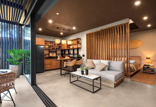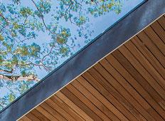 Das Baumaterial hält den rauen tropischen Bedingungen stand. Für die Fassade tes Kiefernholz zum Einsatz. Es wird imprägniert und unter Hitze getrocknet, damit es wetterfest ist und die Fassade für lange Zeit erhalten bleibt. „Wir haben alte und lokale Techniken mit modernen verwoben“, verrät das Architektenteam. Das nachhaltige Design ist in der Vergangenheit verwurzelt und blickt doch in die Zukunft. Heimische Materialien und Bautechniken verstärken die Zugehörigkeit des Hauses zur Landschaft.