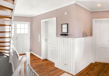 Schweden in der Pfalz. Dafür sorgen L andhaus-Elemente wie die Wandvertäfelung im Flur.