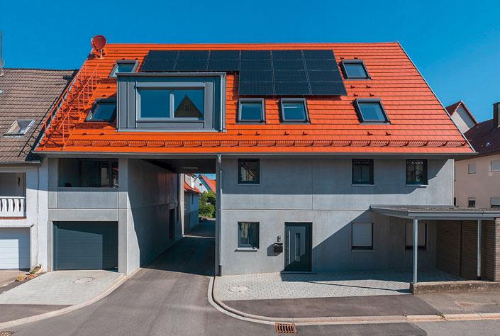 Die Holzvertäfelung an der Hausecke ist ein kleines Detail, mit dem sich das Haus im Wohngebiet abhebt.