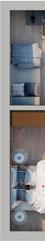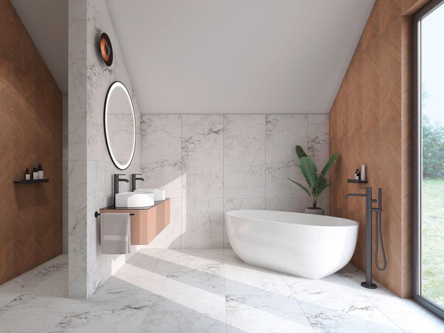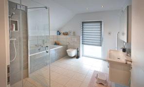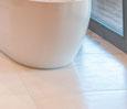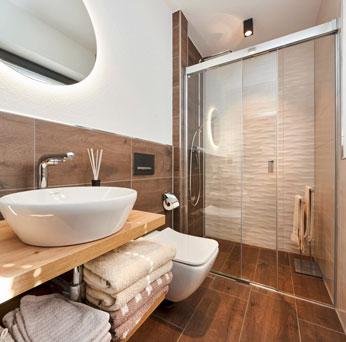 Die Fliesen im Bad sind in Holzoptik gehal ten. Das lässt den ganzen Raum warm und gemüt lich wirken.