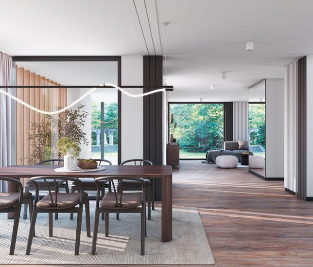 Im Erdgeschoss wird die Nähe zum Wald besonders betont. Durch die großen Fenster der fünf Schlafzimmer schauen die Bewohner durch die Bäume hindurch. Im ersten Stock genießen sie den Weitblick über das Blätterdach hinweg. Hier liegt der große Wohnbereich mit Glasfassade und