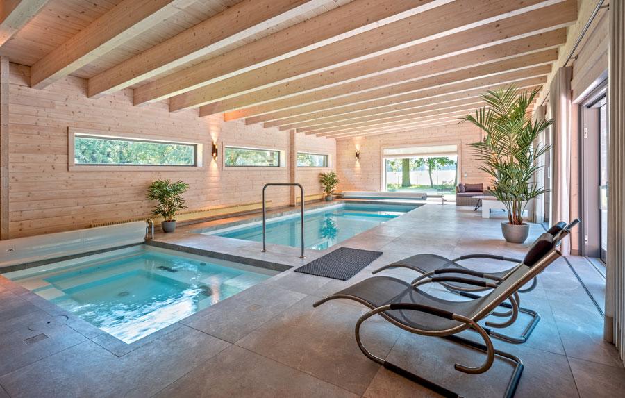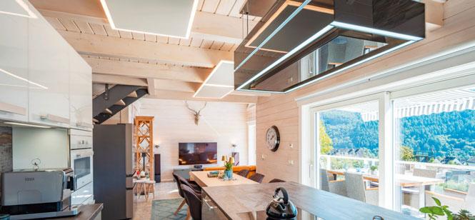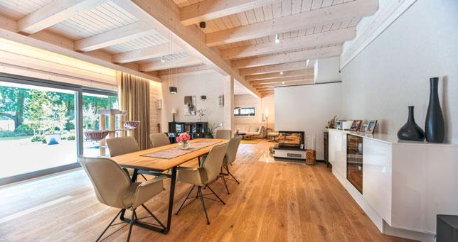 Der Wohn- und Kochbereich im Obergeschoss öffnet sich zur Terrasse. Von hier führt der Weg direkt zum Pool