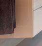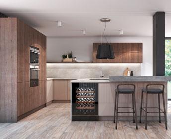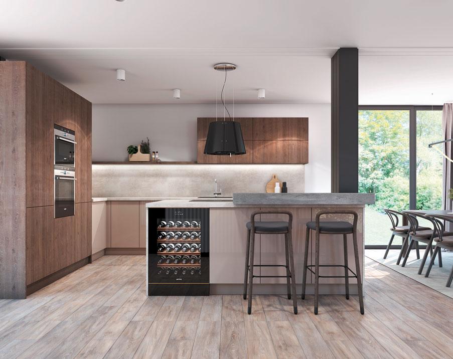 Kühlschränke sind wuchtig. Damit er dezenter wirkt, gibt es einen Wanddurchbruch, in den sich der Kühlschrank schmiegt.
