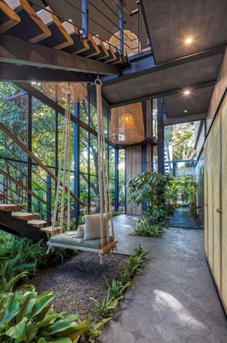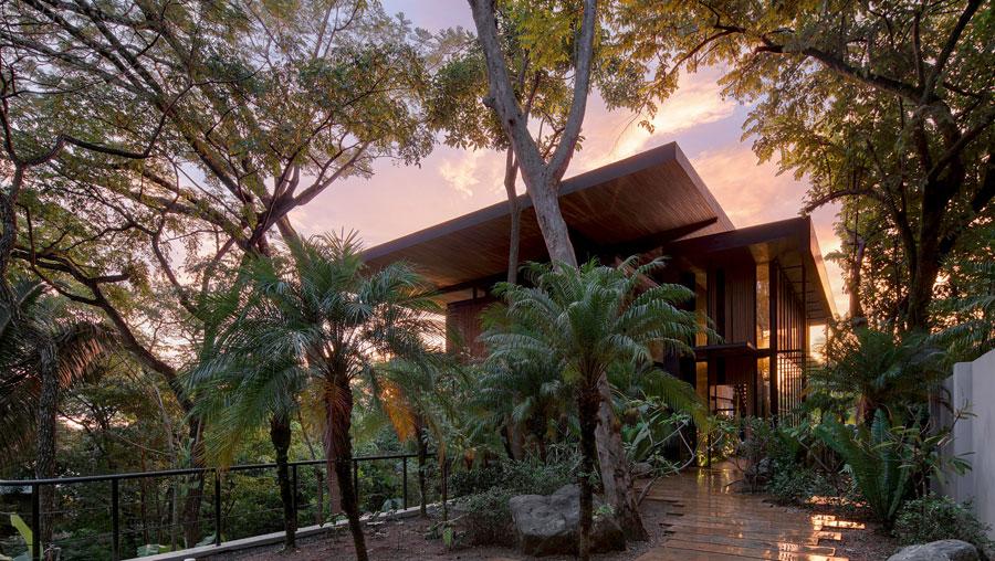 Ein Streifzug durch den Regenwald. Zwischen tiefgrünen Blättern taucht ein Haus auf. „Umarmt vom Blätterdach, im Tanz mit dem Dschungel“, so haben die Bauherren sich ihr neues Zuhause vorgestellt. Es sollte aussehen, als stünde es seit Anbeginn der Zeit hier, wäre mit dem Wald gewachsen. Das „Raintree House“ schmiegt sich an einen Hügel in eine Waldlichtung. Auf der Hügelseite haben die Bewohner durch die großen Glasscheiben das Gefühl, ein Teil des Waldes zu sein. Die Glasfassaden vorne schauen über die weiten grünen Hänge hinweg zum Meer.