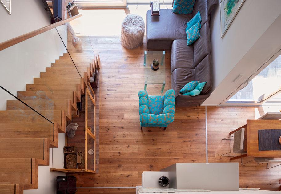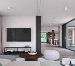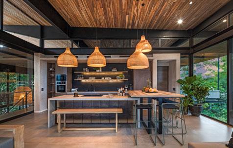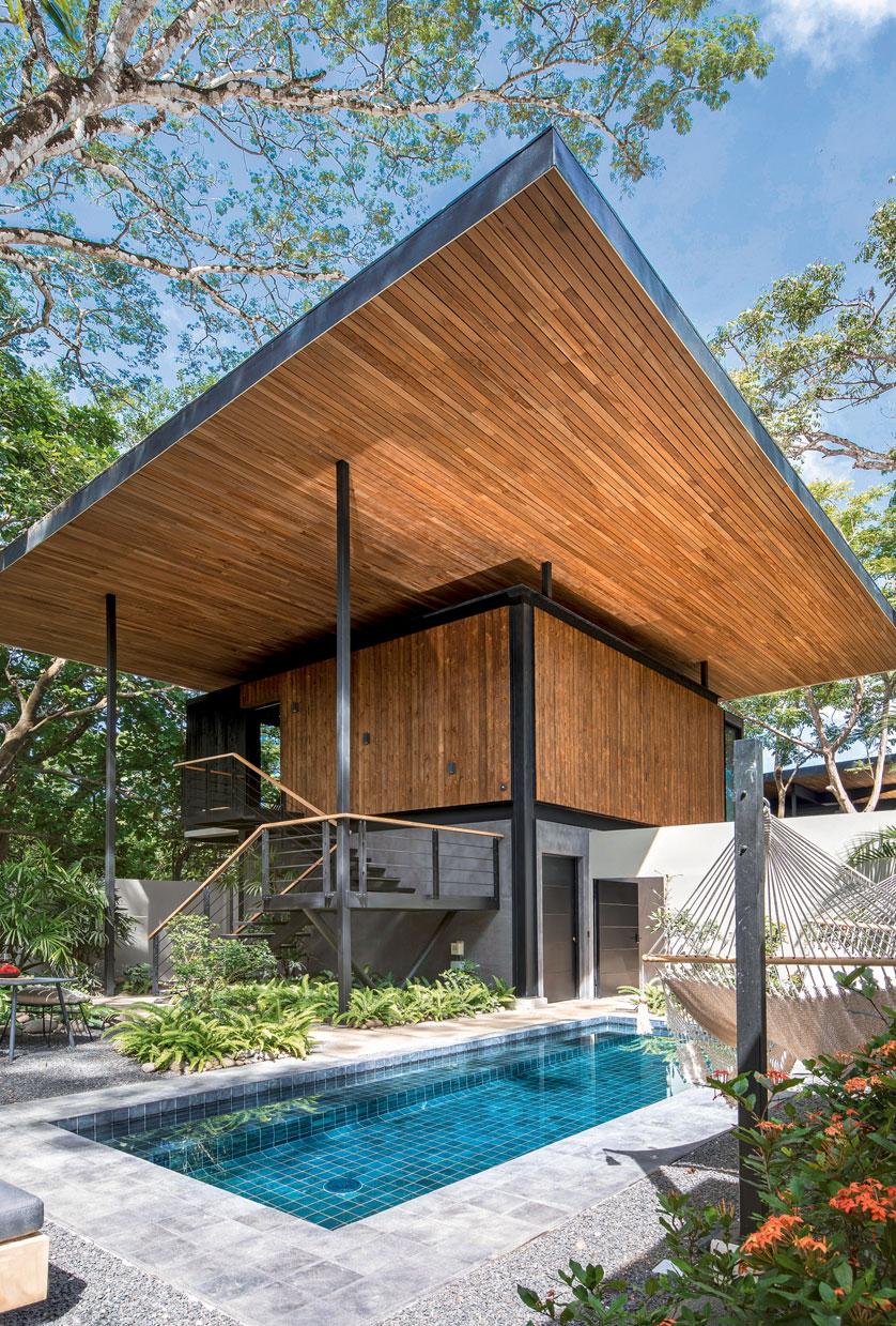 kommt im Obergeschoss unter, mit einem eigenen Balkon. Das Highlight ist die große Terrasse über den Baumkronen mit Pool und Liegestühlen. Die Bewohner haben sich ein Zuhause gewünscht, in dem sie durch die Nähe zur Natur Ruhe und Erdie „Momente der Besinnung“ direkt in das Haus ein. Es zwingt seine Bewohner liebevoll dazu, immer wieder innezuhalten und die durch Fenster gerahmten Sonnenuntergänge zu genießen. (tir)