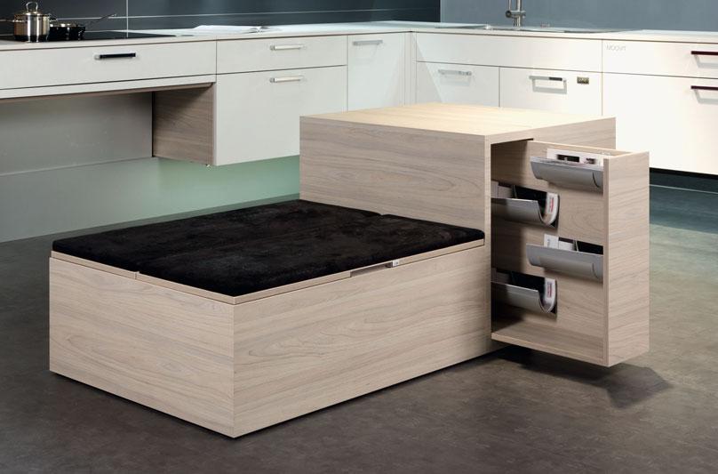 Anders als im restlichen Gebäude, setzt die Kücheninsel mit ihrer grafi schen Optik einen gestalterischen Akzent.