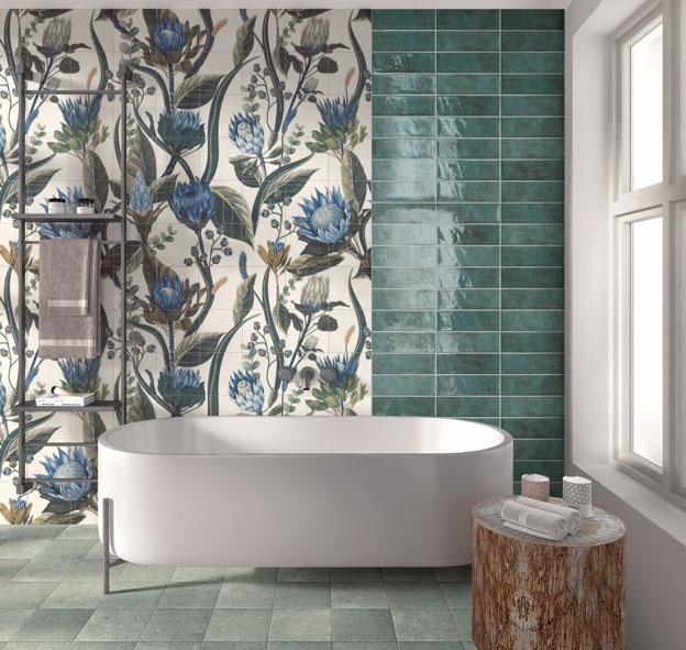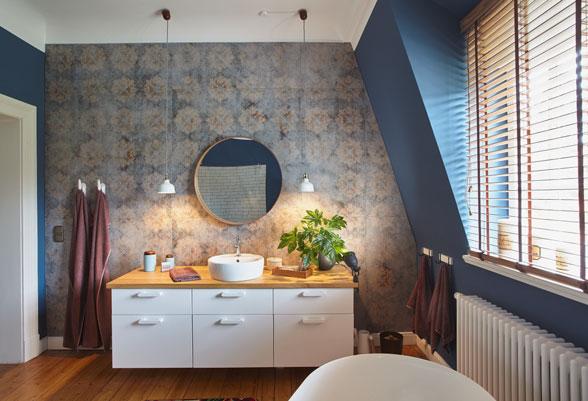Die Tapete hinter dem Waschtisch harmoniert perfekt mit der blauen Wandfarbe und dem originalen Dielenboden.