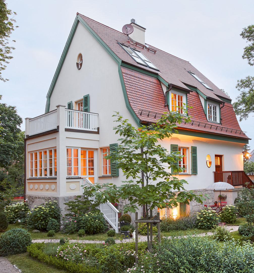Mitten zwischen großen Buchen, einem Meer aus Staudenpflanzen und Buchsbäumen erstrahlt das Haus der Hofmanns. Mit hellgrünen Fensterläden und einem roten Mansarddach bildet es den Mittelpunkt dieses Kleinstadtparadieses. Hier möchte man am liebsten für immer bleiben.