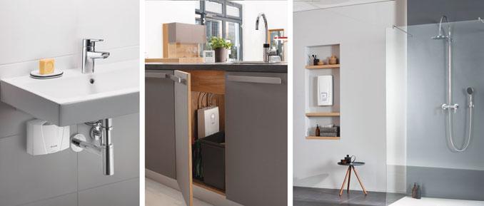 Diese kleinen Geräte sind dort verbaut, wo sie gebraucht werden — nämlich in der Dusche oder am Spülbecken. Sie erhitzen das Wasser bei der Entnahme direkt mit Strom. Neuere Modelle sind auf Photovoltaik abgestimmt und passen ihren Stromverbrauch entsprechend an. Clage