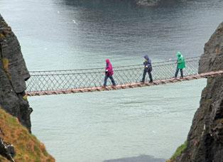 zuverlässige und oft unsichere Seilbrücke vom Festland zur Insel Carrik-a-Rede, um ihre dort in der Brandung ausgelegten Netze zu leeren und zu überprüfen. Über einen düsteren und rauschenden Fjord von rund dreißig Meter Tiefe und auf einer Länge von über zwanzig Meter überspannt heute eine leicht schwankende, aber sichere Seilbrücke den Weg zur Insel. Hasenfüße und Angsthasen machen oft vor der kleinen Kontrollstelle am Brückenkopf kehrt und stapfen den steilen Weg zurück zum Parkplatz.