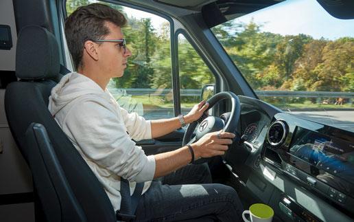 Kart wird der Sprinter aber nicht. Das sollte man auch nicht erwarten. Noch ein Wort zum Spurhalteassistenten: Der arbeitet nicht über Lenk-, sondern über Bremseingriffe – also mithilfe des ESP. Kommt man einer Seitenmarkierung zu nahe, bremst der Mercedes. Das geschieht nun deutlich weniger abrupt und überraschend als beim Vorgänger, so richtig wollen wir uns daran aber nicht gewöhnen. Eine elektromechanische Lenkung wie sie der VW Crafter oder jüngste Fiat Ducato bietet, ist uns da lieber. Die lenkt die Fuhre behutsam von der Fahrbahnbegrenzung weg. Das ändert aber nichts daran, dass die Sprinter-Basis den Crossover zu einem prima Reisefahrzeug macht. Der Vierzylinder-Turbodiesel mit 190 PS und die butterweich schaltende Wandlerautomatik 9G-tronic Plus sorgen für gelassene, komfortable Fortbewegung. Automatik können die Schwaben. Die Kraftreserven