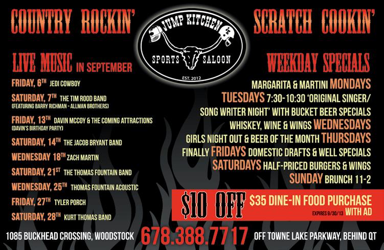 Need a break from your regular lunch routine? Come out to Woodstock’s “Brown Bag Concert Series,” held 12-1 p.m., every Thursday in September. Enjoy Downtown Woodstock with your friends, children and co-workers. Pack your lunch or stop by one of Downtown Woodstock’s many restaurants. Visit WhatsUpWoodstock.com for a schedule of featured musicians. The Park at City Center, 101 Arnold Mill Road, Woodstock