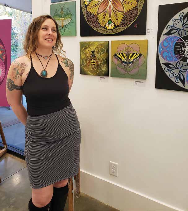 As she works on the 41-inch square panels, she “follows that flow,” sometimes getting lost in painting for eight- or 10-hour stretches. Because the designs and colors are so precise and intricate, they almost appear to be computer-generated.