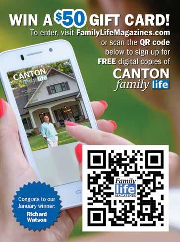 The viewpoints of the advertisers, columnists, and submissions are not necessarily those of the editor/ publisher, and the publisher makes no claims as to the validity of any charitable organizations mentioned. The cover and its accompanying magazine content are a paid advertisement. Canton Family Life magazine is not responsible for errors or omissions. No part of this publication may be reproduced or transmitted in any form or by any means without written permission from the publisher.
