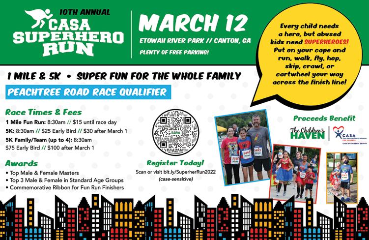 10th Annual CASA SuperHero Run — This run benefits Court Appointed Special Advocates for Children, a program of The Children’s Haven, which advocates for the best interests of Cherokee’s foster youth. 8:00am 1 mile and 8:30am 5K start times, Etowah River Park, 600 Brown Industrial Parkway, Canton. Active. com/canton-ga/running/ distance-runningraces/10th-annualcasa-superhero-run5k-2022