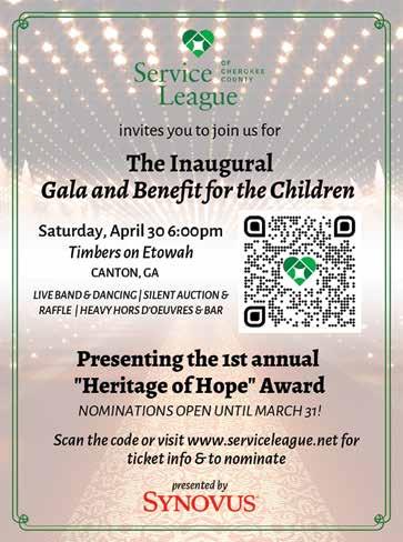 12 Celebration of Education Gala Guests will enjoy dinner by 1885 Grill, musical performances by Ethan Senger and Kurt Lee Wheeler, and comedy stylings of Andrew Stanley. The event will also feature a silent auction and 50/50 raffle tickets. All proceeds benefit Cherokee County School District. 6:00pm, Northside Cherokee Conference Center, 1130 Bluffs Parkway, Canton. 404-683-0182. CherokeeCountyEducationalFoundation.org