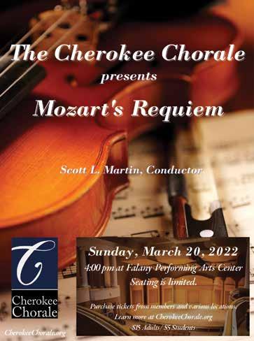 The Cherokee Chorale: Mozart Requiem — In its 34th season spring concert, the chorale will perform the Mozart Requiem under the direction of Scott L. Martin. Tickets are $15/adults and $5/ students. 4:00pm, Falany Performing Arts Center, 7300 Reinhardt Circle, Waleska. 770-720-9167. CherokeeChorale.org