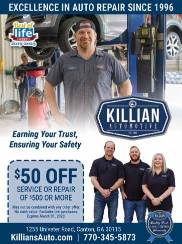 28 Canton Family Life | March 2023 Add to Your Business! Online ads link to advertisers’ websites. Art Jewelers Inside Front BridgeMill Dentistry 5 Canton Wellness Center 3 The Carpenter’s Shop Inside Front Chatt Tech 19 Cherokee Chorale 3 Cherokee Floor Covering 23 Christian Brothers Automotive — Cherokee Cover, 14-15 Darby Funeral Home, Inc. 28 Great Sky 5 Harmony Orthodontics Inside Back Jyl Craven Hair Design Back Cover Killian Automotive 19 Landscape Matters 9 Masterpiece Framer Inside Back Next Step Ministries 28 PhotoJack.net 25 “Pint”wood Derby Benefiting Children’s Healthcare of Atlanta 17 St. George Village 1 Woodstock Funeral Home 3 Advertiser Index
