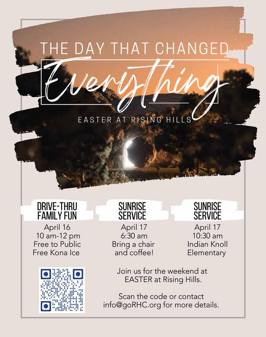 17 Sunrise Easter Service – 6:30am. Bring a chair, warm coffee, and celebrate that Christ has risen. This event is at Rising Hills Church property, 3693 Hickory Flat Highway (subject to change based on construction).