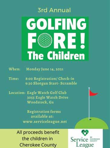 Golfing FORE! The Children Golf Tournament — Presented by the Service League of Cherokee County, play golf for a great cause. All proceeds will go to help children in need in Cherokee County. 7:30am registration and 9:00am shotgun start, Eagle Watch Golf Course, 3055 Eagle Watch Drive, Woodstock. ServiceLeague.net