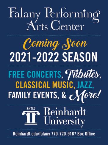 Crazy for Patsy Cline, Featuring Katie Deal — Enjoy this outdoor concert with songs made famous by the beloved country artist, Patsy Cline. 3:00pm and 7:30pm, Falany Performing Arts Center, 7300 Reinhardt Circle, Waleska. 770-720-9167 Reinhardt.edu/ falany/tickets