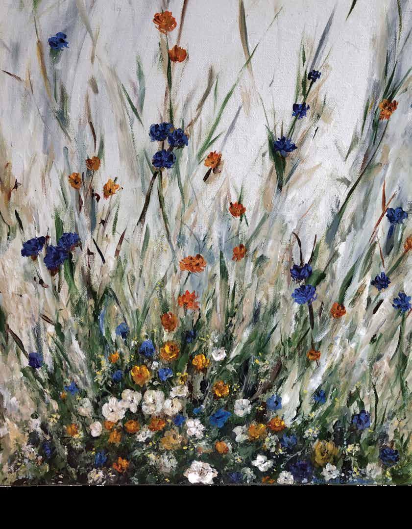 In an array of colors, some canvasses burst with bold brushstrokes that mirror the curves and dynamism of her sculptures; others, while also colorful, more quietly depict flowers and trees in quicker brushwork characteristic of impressionism. Working in acrylics, she engages with the painting as it evolves, “layering, moving from dark to light, light to dark.”