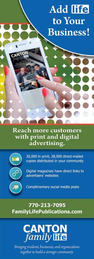 The viewpoints of the advertisers, columnists, and submissions are not necessarily those of the editor/ publisher, and the publisher makes no claims as to the validity of any charitable organizations mentioned. The cover and its accompanying magazine content are a paid advertisement. Canton Family Life magazine is not responsible for errors or omissions. No part of this publication may be reproduced or transmitted in any form or by any means without written permission from the publisher.