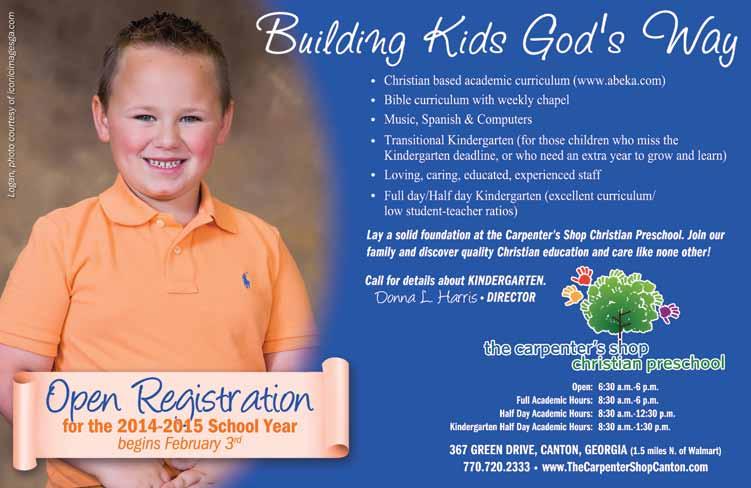 open House — Cherokee Christian Schools’ Open House is an excellent and informative time for prospective families to tour the campus, meet staff and faculty, and to find out more information about the school. Light refreshments will be served. Children are welcome to attend 7:00 p.m., Cherokee Christian Schools, 3075 Trickum Road, Woodstock. 678-494-5464, CherokeeChristian.org