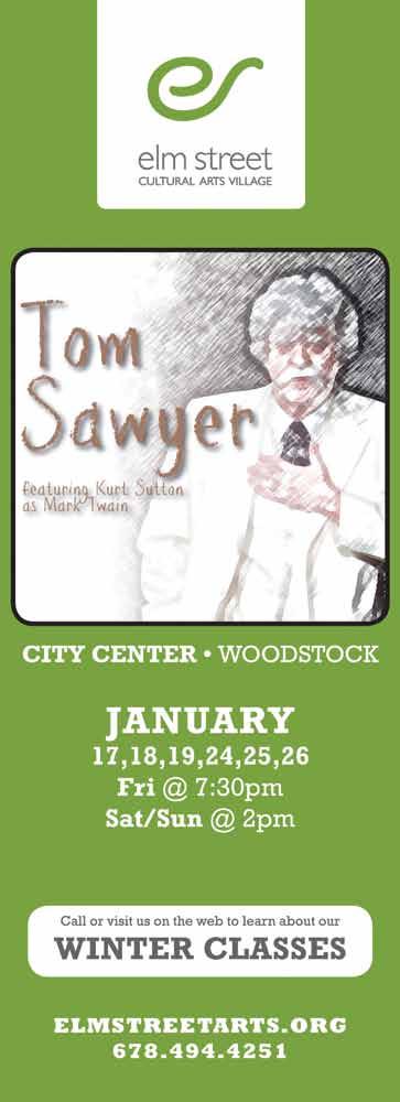 as Twain. A portion of the proceeds will benefit teen programs at Families of Cherokee United in Service. Tickets are available online in advance and at the door. 7:30 p.m., January 17 & 24; 2:00 p.m., January 18-19, 25-26, City Center Auditorium, 8534 Main St., Woodstock. 678-494-4251, ElmStreetArts.org