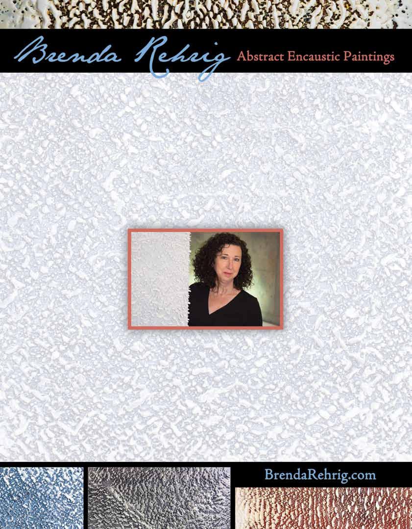 meaning the build-up of wax on surfaces — takes a lot of skill,” the artist notes. “The learning process was frustrating at times.” The average size of Rehrig’s paintings is 40 inches x 40 inches or larger, and she produces one piece at a time. Inspired by her love and respect for the natural world, Rehrig explores texture and luminosity by starting with a basic concept such as “Fog” or “Water” or “Sunrise” and lets the colors guide her. “I am trying to get away as far as possible from pictorial art. Through the use of certain colors I create a mood rather than a scene.”