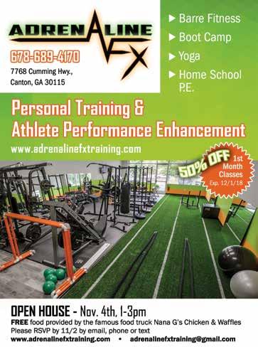 Meet the ADRENALINE FX staff, and check out their facility at their open house on November 4 from 1:00-3:00pm. There will be FREE food provided by The famous food truck Nana G’s Chicken & Waffles, so bring the family, and check them out! Please RSVP by November 2 by phone/text at 678-689-4170 or by email at AdrenalineFXTraining@gmail. com. Check out pricing and schedules at AdrenalineFXTraining.com. They look forward to helping you!
