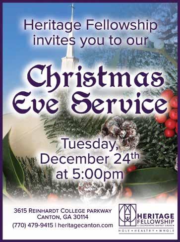 of topics. December’s topic is “Senior Auto Insurance,” presented by Michael Preston. 12:00-1:00pm, Heritage Fellowship, 3615 Reinhardt College Parkway, Canton. Please RSVP for lunch 770-479-9415 or JBishop@ heritagecanton.com. HeritageCanton.com