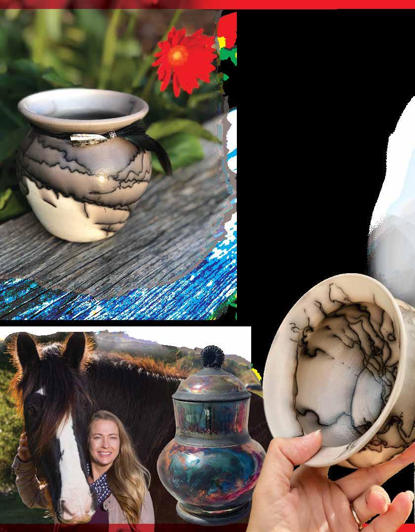 Each piece includes the animal’s name, and if desired, comes with a video of the creation of the piece. Twenty-five percent of all horsehair raku purchases helps Save the Horses, a nonprofit rescue organization where Soresi volunteers her time. She also makes memorial urns for people and pets.