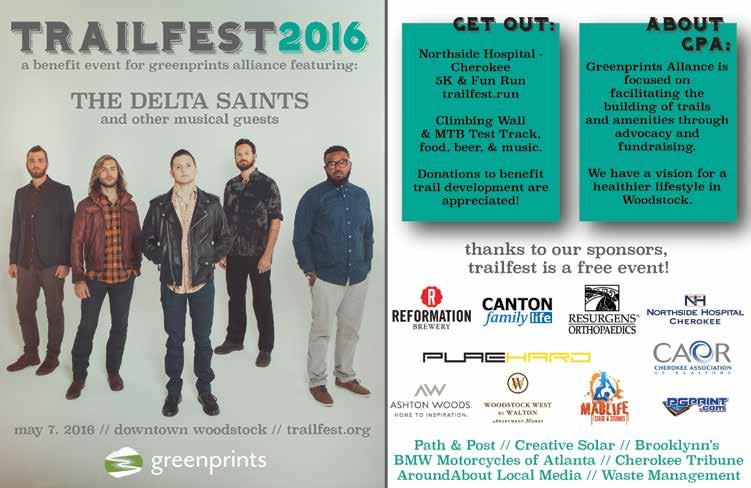 concrete, multi-use trails that are the beginning of a master planned system. Already completed and in use is the Noonday Creek Trail, which is 1.5 miles long and runs from Downtown Woodstock to Hwy 92, along the Noonday Creek corridor. It also connects to the Woofstock Dog Park via a beautiful, spanning bridge. Connections to Towne Lake, Olde Rope Mill Park and Cobb County trails are planned by 2021.