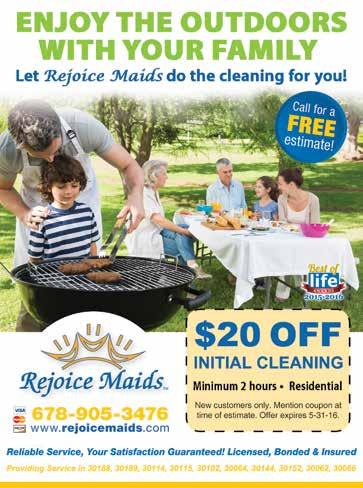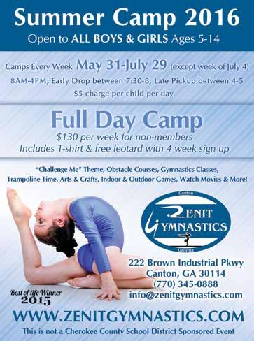 13 Cherokee County’s Relay for Life — The American Cancer Society Relay For Life movement is the world’s largest and most impactful fundraising event to end cancer. It unites communities across the globe to celebrate people who have battled cancer, remember loved ones lost, and take action to finish the fight once and for all. 6:00-midnight, River Ridge High School, 400 Arnold Mill Road, Woodstock. Main.ACSEvents.org/site/TR/ RelayForLife/RFLCY16SA?pg=entry&fr_id=70770