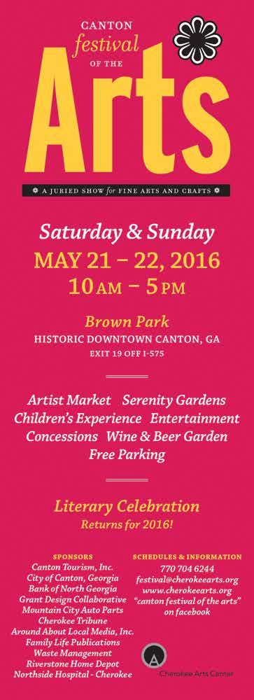 Canton Festival of the Arts — Come visit this juried show of fine arts and crafts. There will be an artist’s market with over 75 exhibitors from 9 different states. The festival will also have: Serenity Gardens, food concessions, a beer and wine garden, interactive children’s activities and live entertainment. 10:00 am-5:00 pm, Downtown Canton. 770-704-6244. CherokeeArts.org