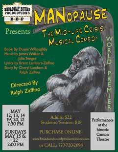 MANopause the Musical! Produced by Broadway Bound Productions, come see the world premiere of this original musical comedy about men having a midlife crisis, and the women who try to love them through it. Due to some language and adult subject matter, parental discretion is advised. ThursdaySaturday performances at 7:30 pm, Sunday matinee at 2:00 pm, Canton Theatre,151 Elizabeth Street, Canton. 770-720-2698. BroadwayBoundProductionsInc.com