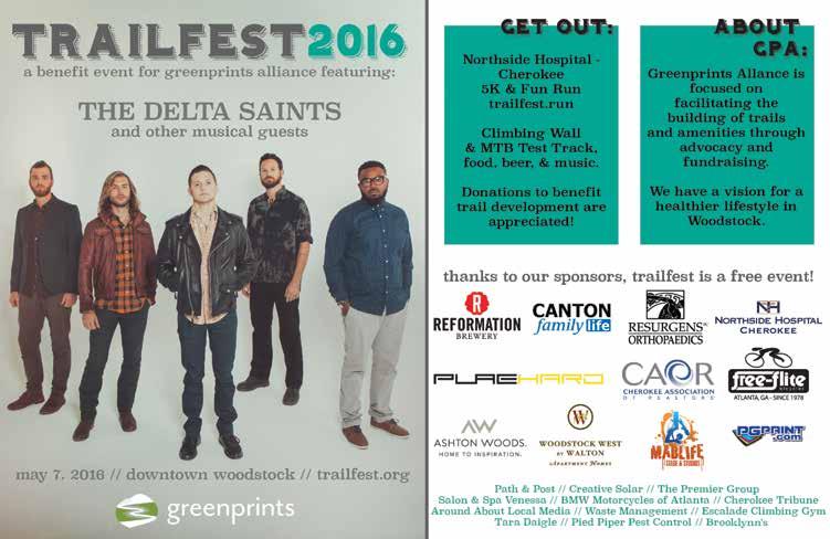 Trailfest — Live music, featuring the Delta Saints, food vendors and outdoor activities — including a 5k fun run, 1/8 mile test track mountain bike trail, a rock climbing wall and many other activities. 8:00 am, Resurgens Orthopedics Community Stage, Elm Street Cultural Arts Village and the Park at City Center, Downtown Woodstock. 770-5176788. GreenPrintsAlliance.org
