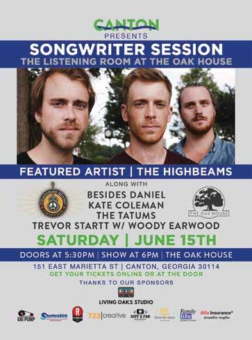 Songwriter Sessions — The Oak House and Cherokee Music Center present local songwriters Besides Daniel, Kate Coleman, The Highbeams, Trevor Startt with Woody Earwood, and The Tatums for your listening enjoyment. Come discover your new favorite artist! 6:00-10:00pm, The Oak House, 151 E. Marietta Street, Canton. 678-653-6625. TheOakHouse.com