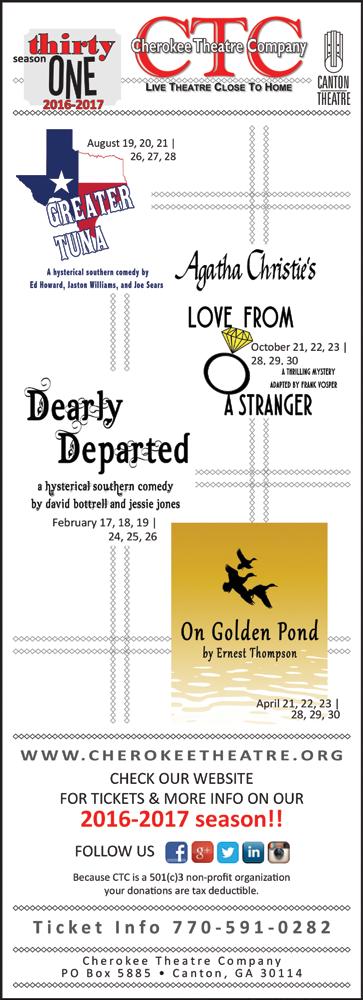 21-8/31 Steel Magnolias — This classic story is presented by the City of the South Theatre Company. Thursday-Saturday at 7:30 pm, Sunday at 2:30 pm, Canton Theatre, 171 East Main Street, Canton. 770-704-0755. CantonTheatre.com