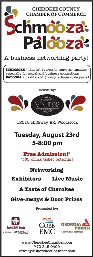 latest products and services featured at SchmoozaPalooza. 5:00-8:00 pm, Venue 92, 12015 Highway 92, Woodstock. 770345-0400. CherokeeChamber.com