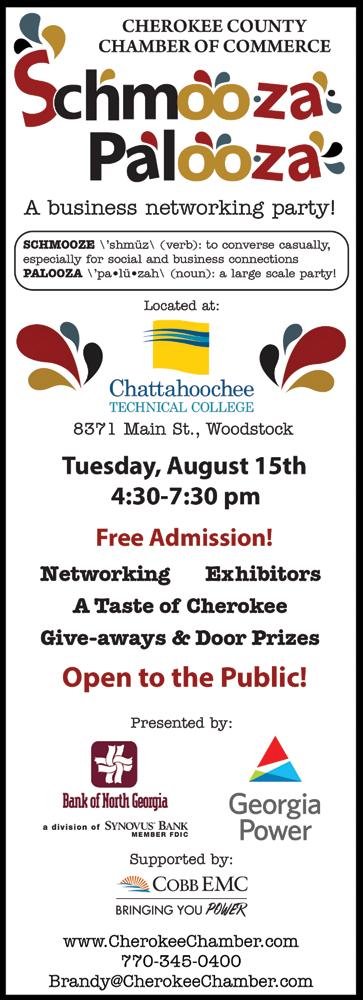 SchmoozaPalooza is designed to bring businesses together in a fun and casual networking environment. Exhibitors will have a table-top display that will allow them to promote their business and make new contacts, while attendees will enjoy door prizes, food and fun, as they preview the latest products and services. 4:30-7:30pm, Chattahoochee Technical College, 8371 Main Street, Woodstock. 770345-0400. CherokeeChamber.com