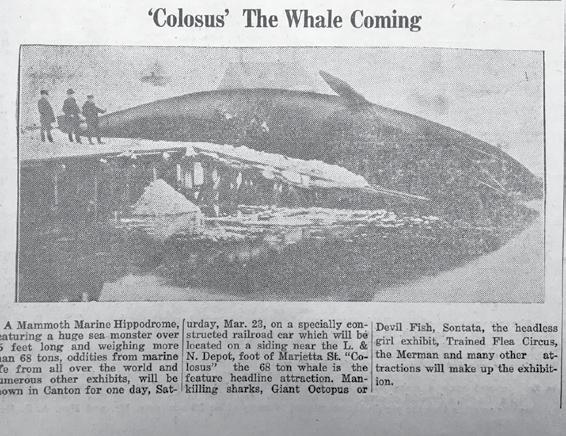 Folks in Cherokee County were in for a treat in the early spring of 1940 when it was announced that a “mammoth marine hippodrome” was on its way to Canton. The headliner of the exhibit was “Colosus” the 68-ton embalmed whale, which was shipped on a specially constructed rail car to the L&N Depot on Marietta Road. In addition to the whale, crowds from Canton could also view “man-killing sharks; giant octopus or devil fish; Sontata; the Headless Girl exhibit; Trained Flea Circus; the Merman and many other attractions.”