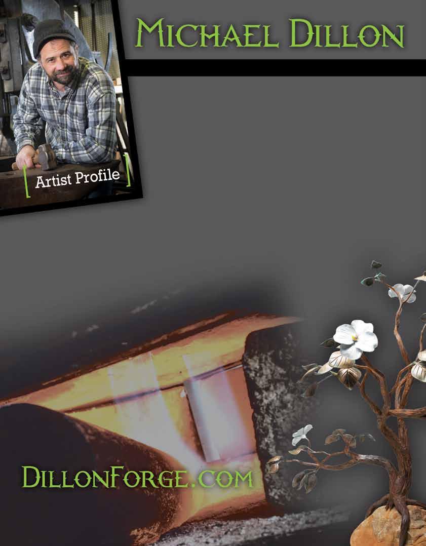 Surrounded by the tools of his trade and by many masterpieces forged by his own hands, as well as his home and his family, Dillon says, “My family and community inspire me every day. I love what I do, inspired by nature, blacksmithing, and industrial machinery.”