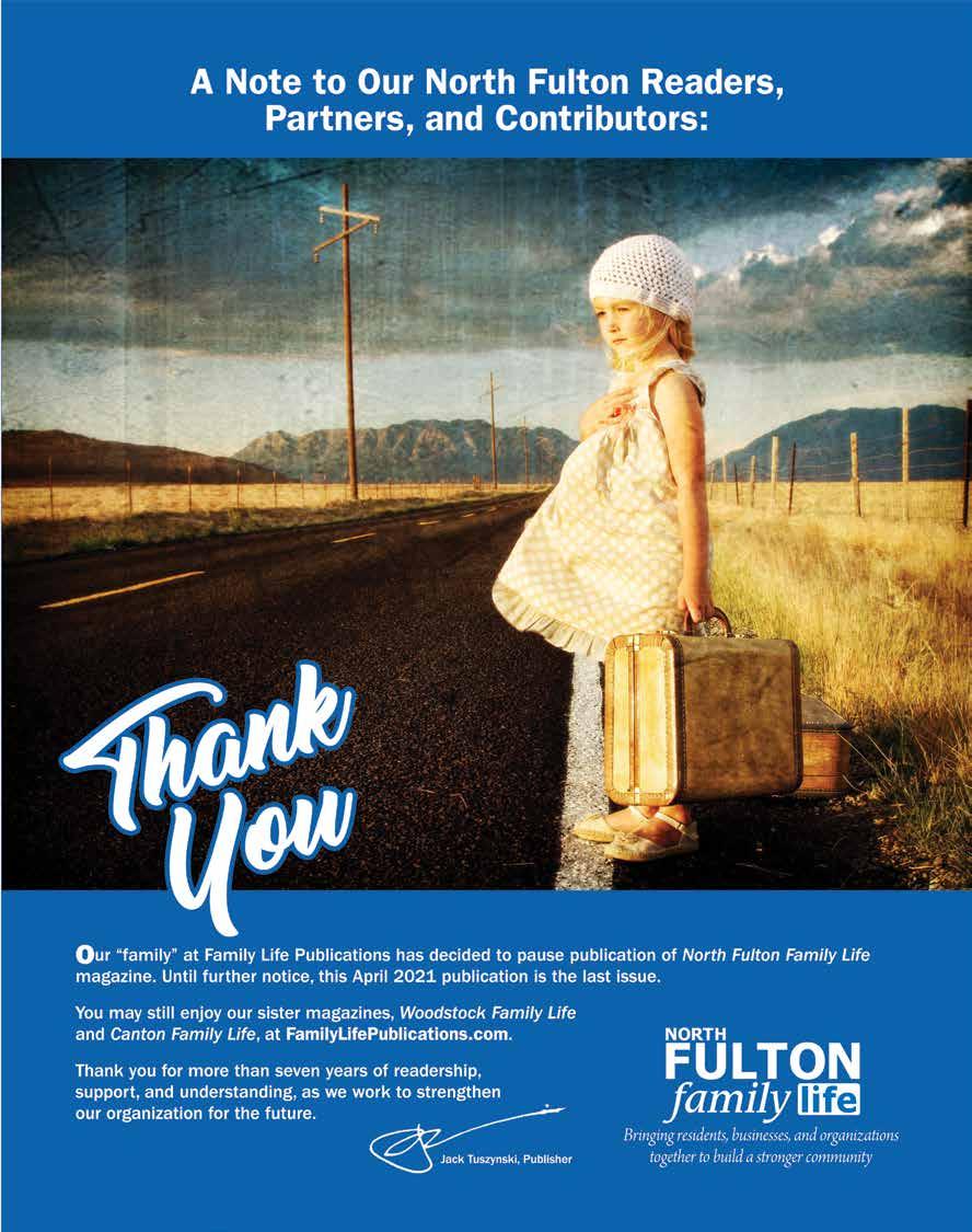The viewpoints of the advertisers, columnists, and submissions are not necessarily those of the editor/publisher, and the publisher makes no claims as to the validity of any charitable organizations mentioned. The cover and its accompanying magazine content are a paid advertisement. North Fulton Family Life magazine is not responsible for errors or omissions. No part of this publication may be reproduced or transmitted in any form or by any means without written permission from the publisher.