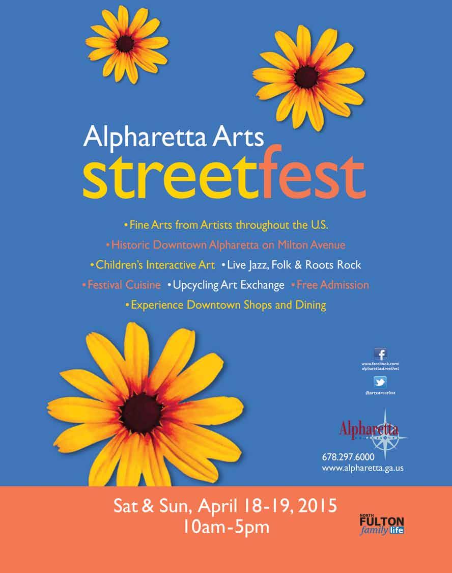 Alp haretta Arts StreetFest The streets of Historic Downtown Alpharetta will be closed as nearly 100 artists, musicians and performers from throughout the U.S. are showcased. Enjoy outdoor galleries filled with fine art in 14 medium expressions, create children’s art and experience live jazz, Celtic music, cultural dancing and more. Admission and parking are free. 10:00 a.m.-5:00 p.m. Alpharetta Arts StreetFest, Milton Ave. and Main Street, Alpharetta. AwesomeAlpharetta.com